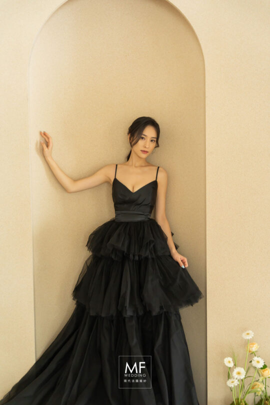 MF WEDDING 晚禮服系列 | 黑金細肩帶開衩長裙晚禮服