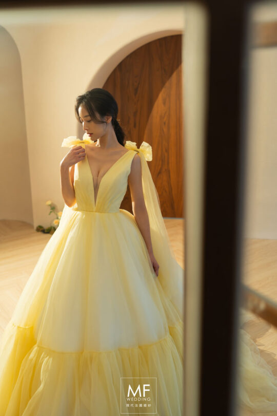 MF WEDDING 晚禮服系列 | 鵝黃蝴蝶結深V拖尾長裙