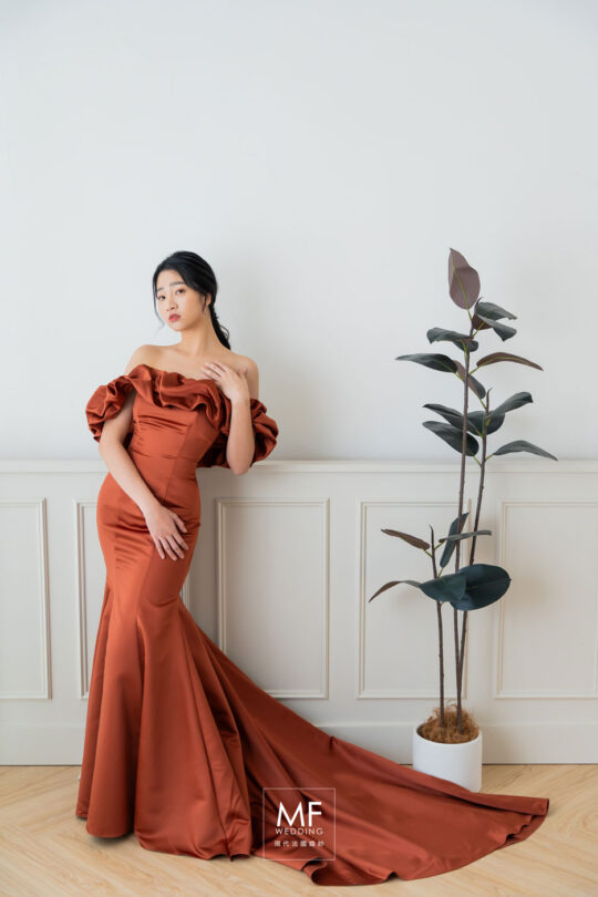 MF WEDDING 晚禮服系列 | 焦糖橘絲緞荷葉肩魚尾禮服
