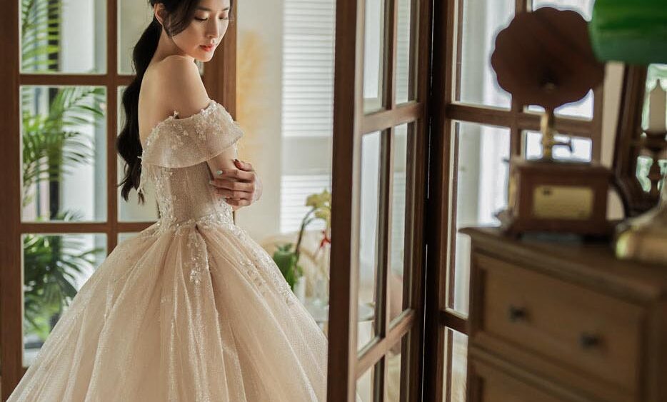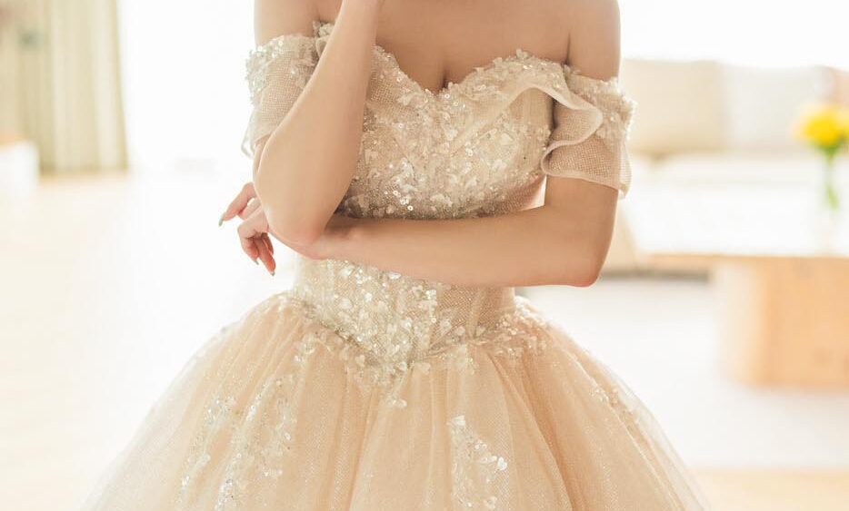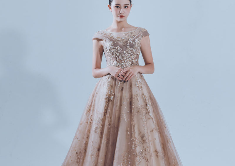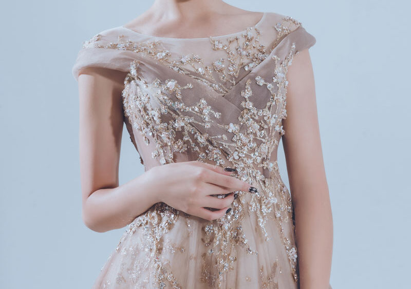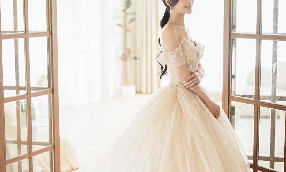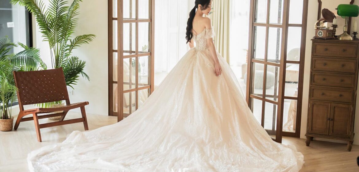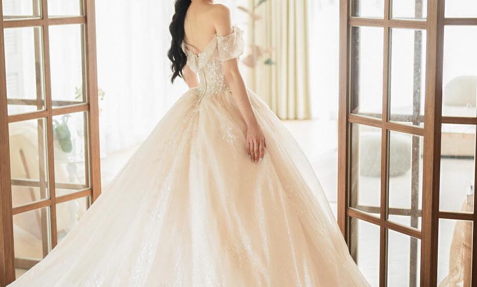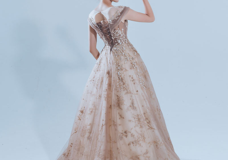 MF WEDDING 晚禮服系列 | 香檳刺繡細閃一字肩禮服