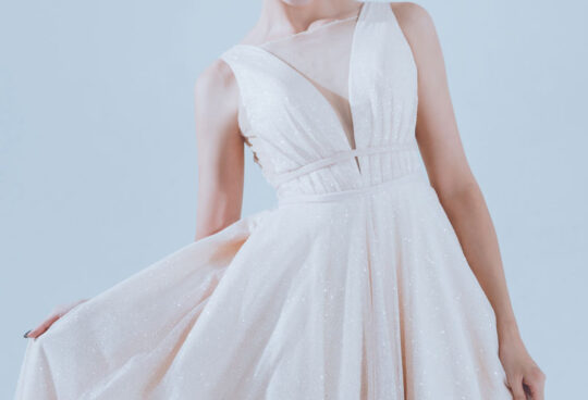 裙擺以輕盈的層層紗布交織,彷彿無数花瓣在新娘的步履間翩翩起舞。