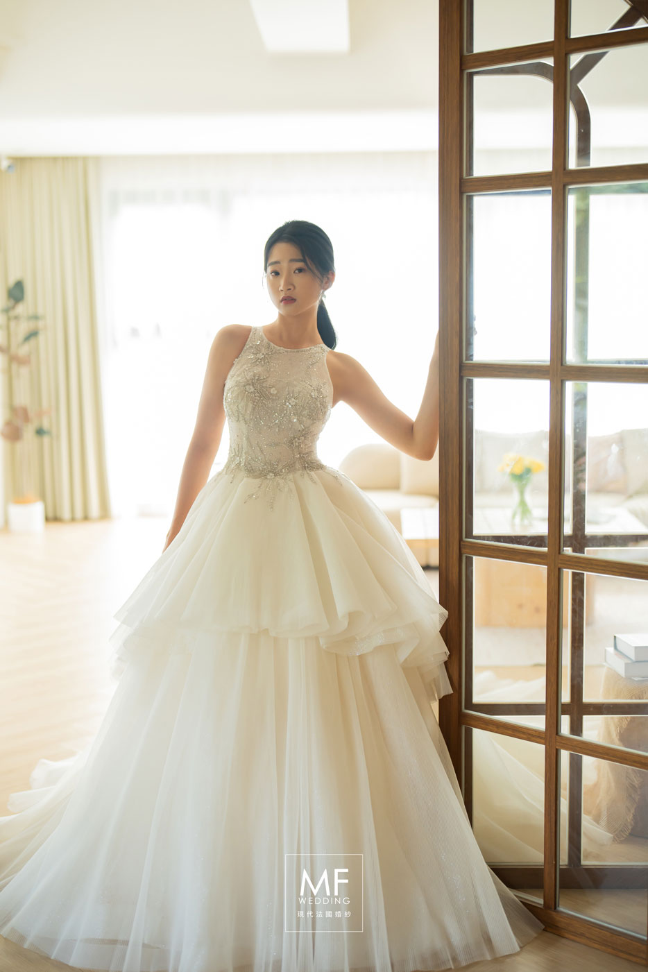 無論是作為白紗進場或室內拍攝造型,都能展現新娘自信又溫柔的氣質。