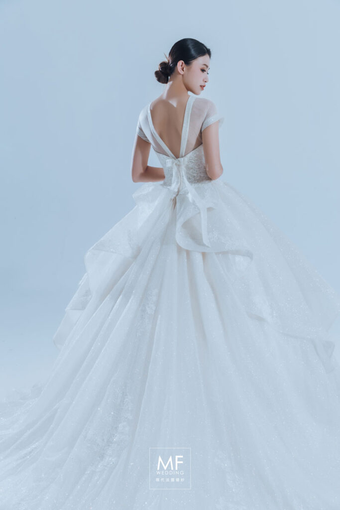 MF WEDDING 精緻白紗系列 | 短袖美背婚紗 短袖露背婚紗是結合浪漫與性感的完美選擇! 短袖設計輕盈俐落,露背剪裁則巧妙展現新娘的優雅曲線。 這種婚紗常搭配蕾絲、薄紗或珍珠點綴,細節精緻又不失大氣。 適合戶外婚禮或夏日婚禮,搭配自然系髮型穿上既清爽又充滿魅力。