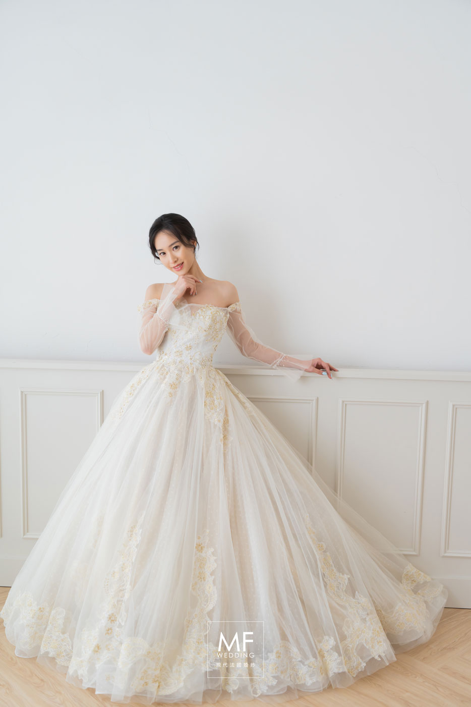 MF WEDDING 精緻白紗系列 | 米白金刺繡一字肩長袖蓬裙